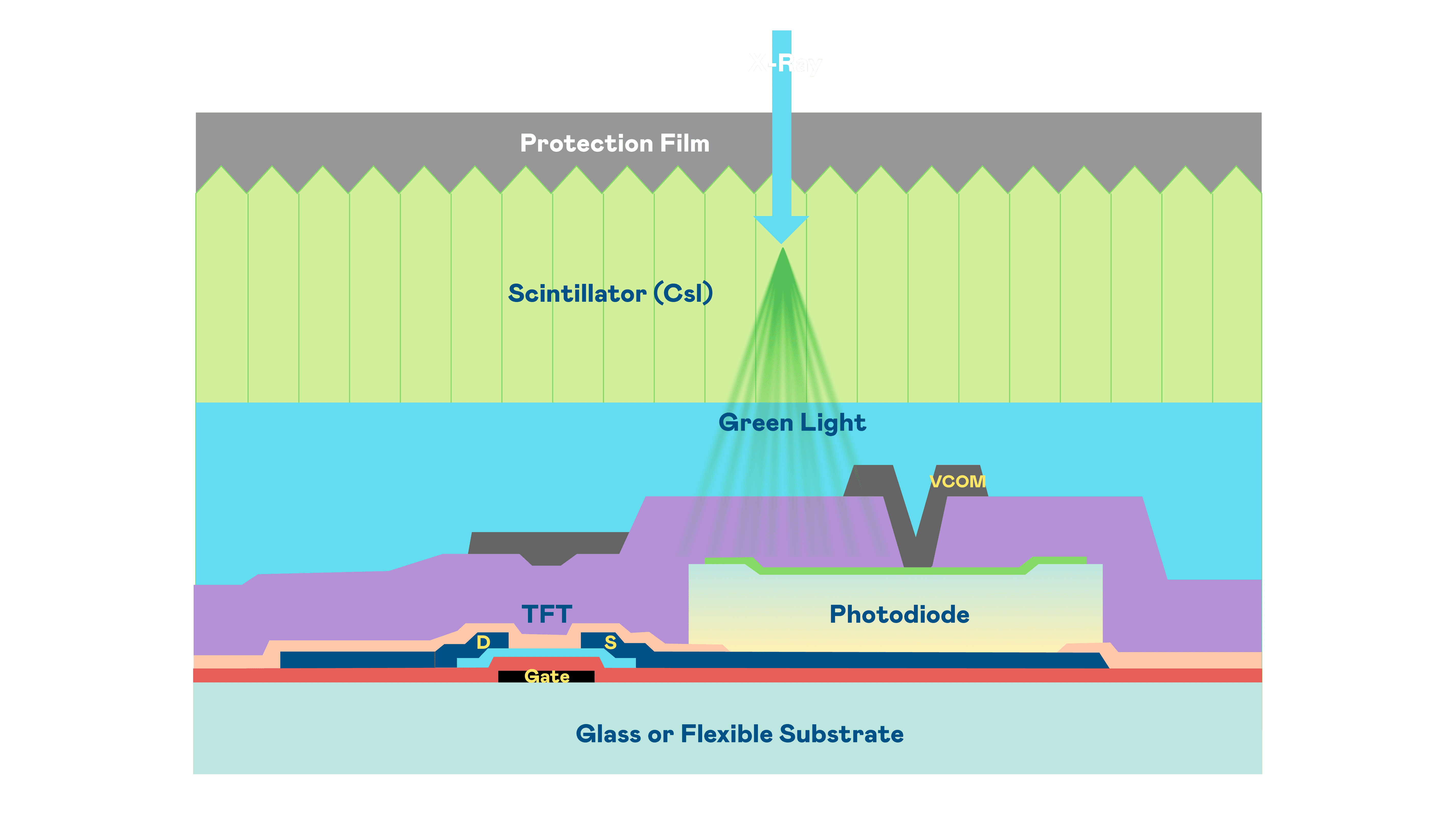 JDB电子的X光影像感测阵列使用薄膜电晶体 (TFT) 作为每个像素的读取开关,,搭配光电二极体(Photodiode)的光电转换元件,,用以感测X光影像讯号。。